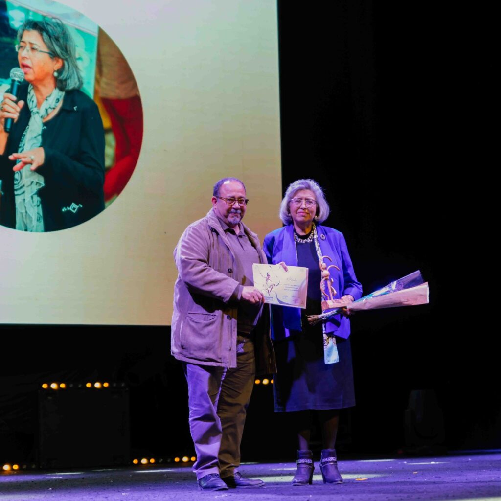 ثم جاءت فقرة التكريمات والتي تحاكي صيرورة المركز الوطني لفن العرائس في خمسينيته، حيث كرم المهرجان كلا من الفقيد عبد العزيز الميموني، والمديرة السابقة لأيام قرطاج لفنون العرائس والمركز الوطني لفن العرائس منية عبيد المسعدي، وقيدومة العرائسيين حبيبة الجندوبي وأحد المديرين الذين مروا بالمركز قاسم اسماعيل الشرميطي.