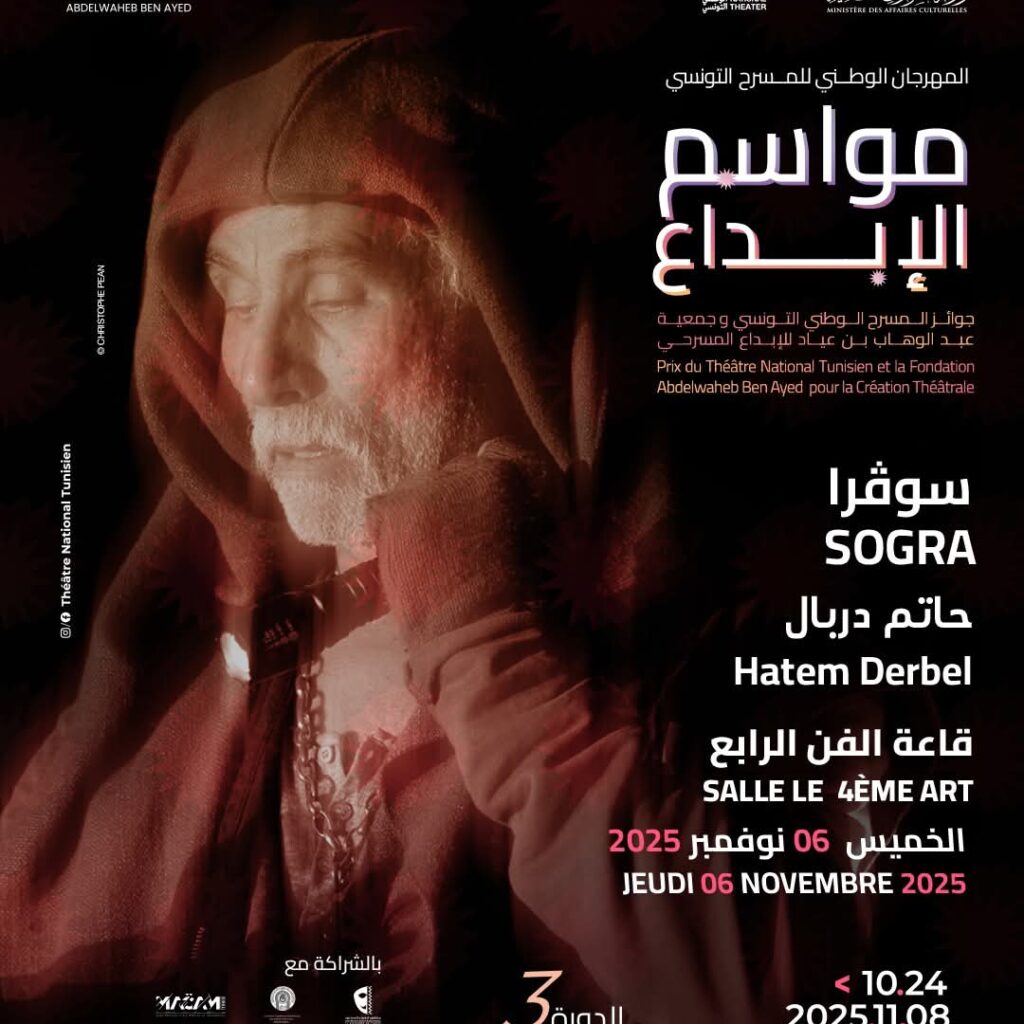 يقدم المخرج المسرحي حاتم دربال يوم الخميس 6 نوفغمبر بقاعة الفن الرابع اخر اعماله الإبداعية والمتمثلة في مسرحية سوقرا عن نص لحاتم دربال ونرجس عمار بطولة توفيق العايب وبسمة العشي وسندة أحمدي